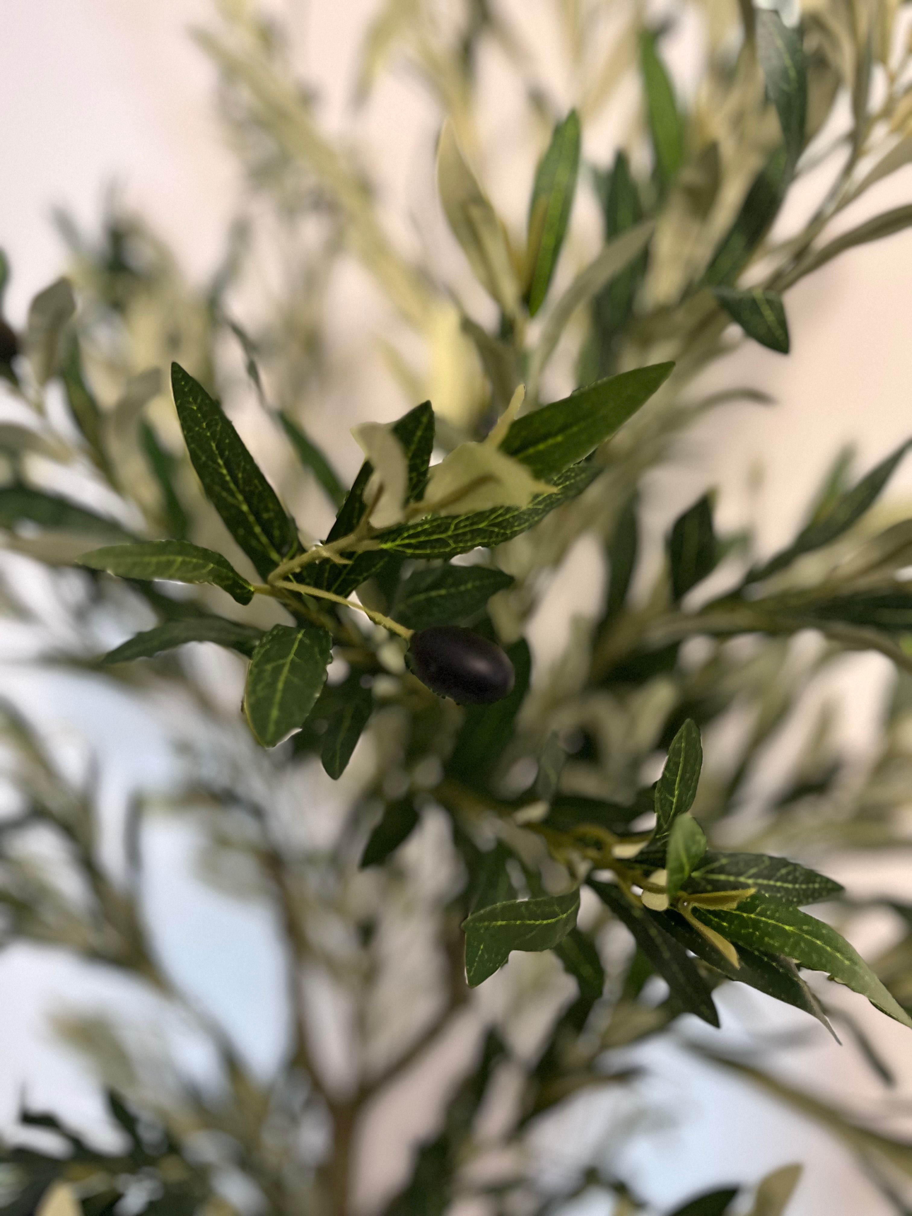 Réalisme à couper le souffle : Un tronc texturé et des feuilles aux nuances vert-argenté, agrémentées de petites olives factices pour une illusion parfaite.